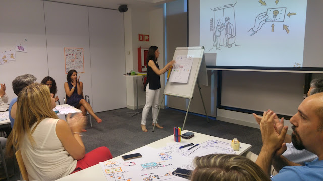 En nuestro último taller, en la universidad corporativa Bankinter, hemos trabajado con un equipo de veinte participantes sobre las metodologías del Visual Thinking aplicadas al trabajo personal y en equipo. Planteamos una mezcla de teoría y práctica que ayuda a dar sentido al por qué de esta metodología. Los ejercicios están diseñados con la finalidad no solo eliminar barreras y dificultades con el dibujo sino, además llevarlo a las salas de reunión, a la manera de trabajar y a los espacios de proyecto en que compartimos tanta información y como diría Dan Roam, tanto Bla bla bla....